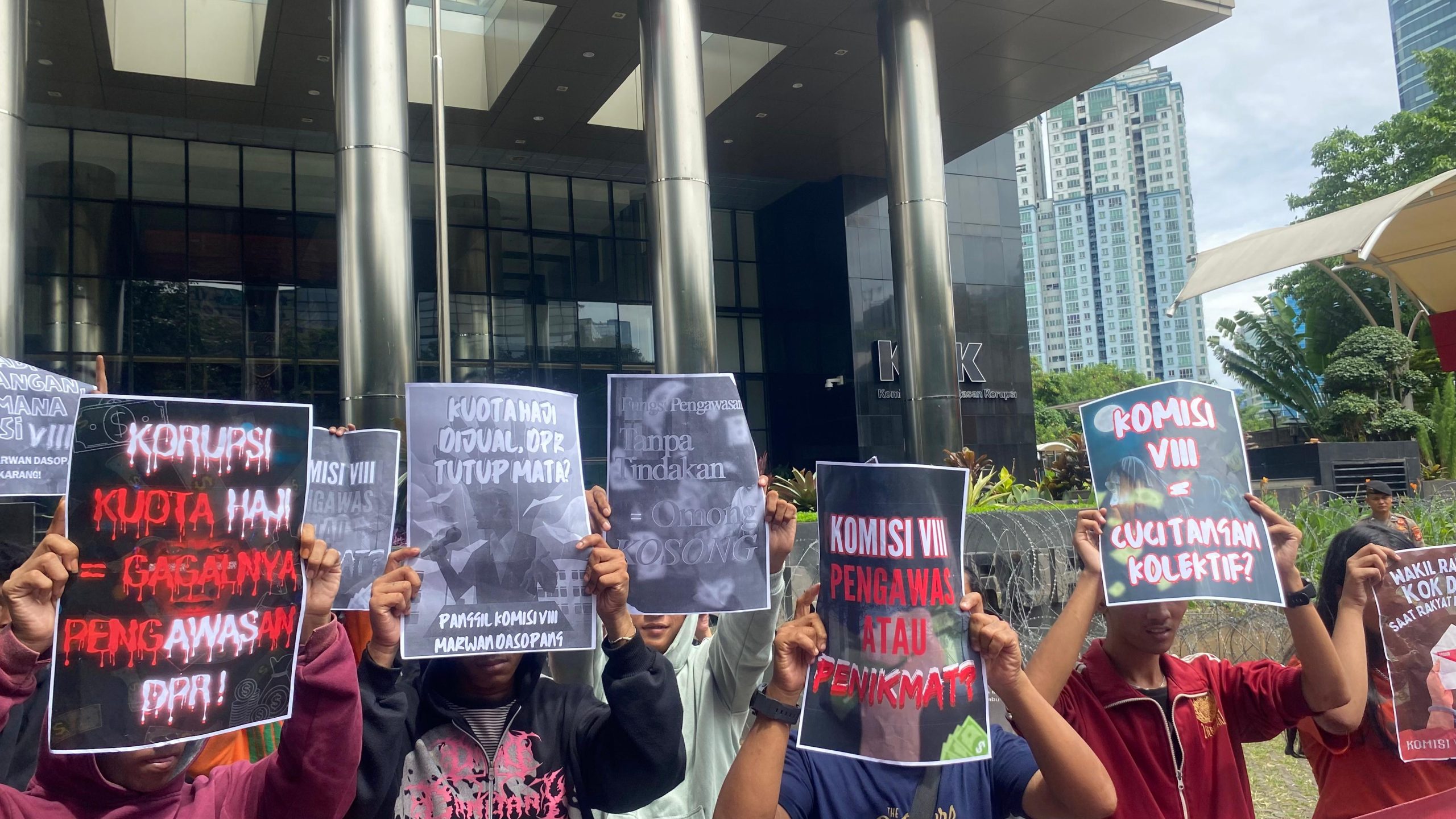 Dalam aksi tersebut, massa membentangkan sejumlah spanduk dan poster, di antaranya bertuliskan: “Komisi VIII: Tahu Tapi Diam = Ikut Menikmati?”, “KPK Jangan Takut Panggil Dewan!”, dan “Korupsi Haji = Pengkhianatan Ibadah!”.