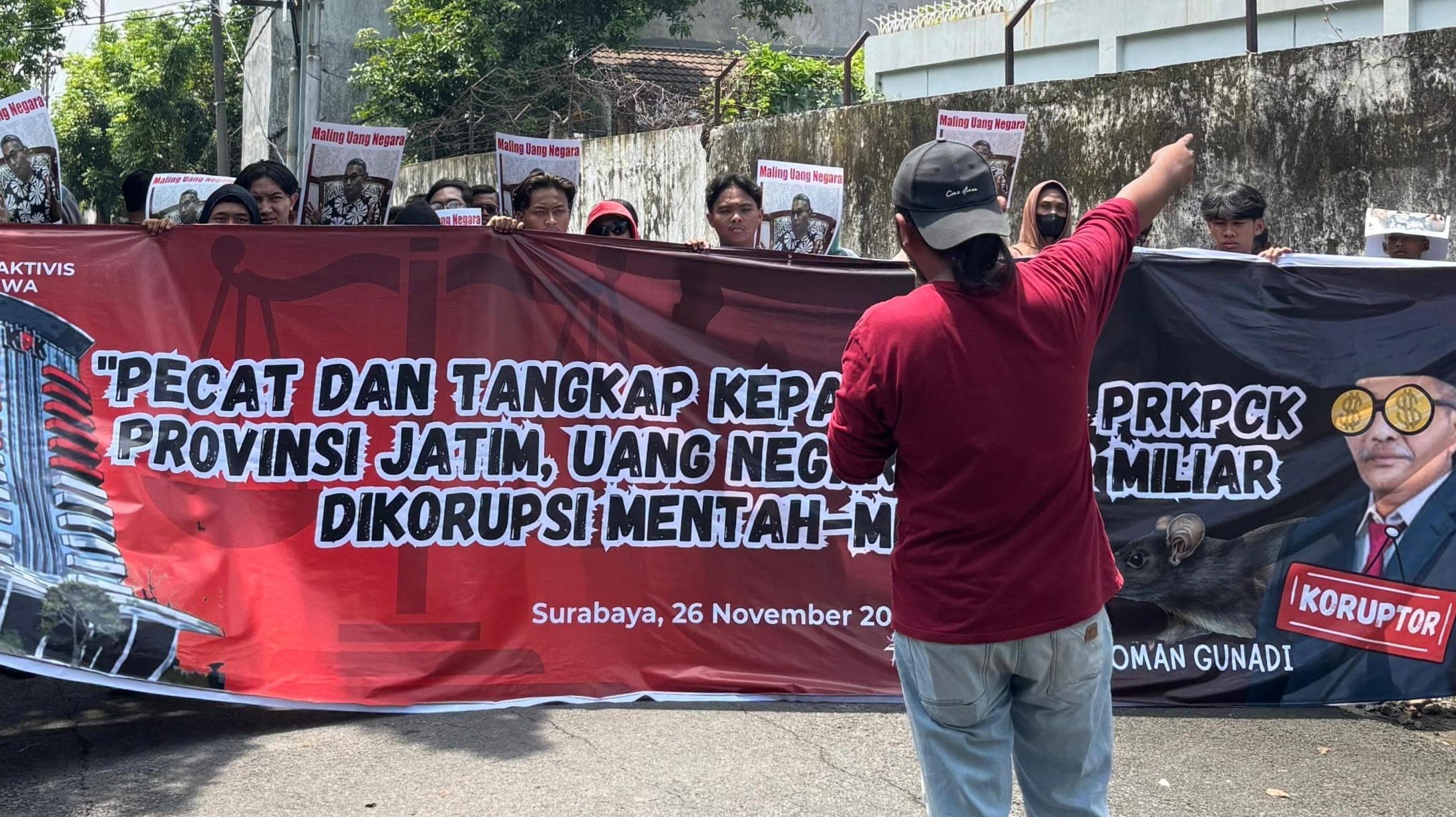 Aksi tersebut digelar sebagai bentuk protes terhadap dugaan penyimpangan dana hibah senilai Rp249,2 miliar di lingkungan Dinas PRKPCK Jatim.