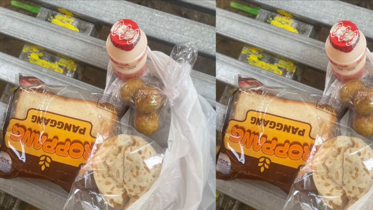Dalam video tersebut tampak sebuah kemasan plastik berisi roti roppang, sebotol Yakult, dan empat buah klengkeng.
